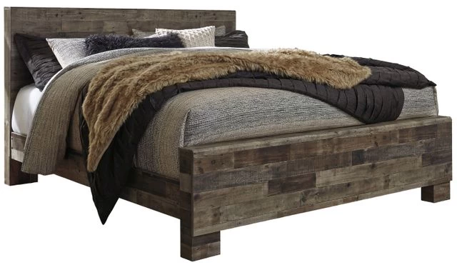 Rustic butcher block finish over replicated pine grain with authentic touch. Cases feature a framed front and pilasters. Bed features a thick and heavy design. Contemporary handles in an antiqued gunmetal finish. Side roller glides for smooth operating drawers. Drawer interiors finished with a replicated linen design for a clean, finished look.