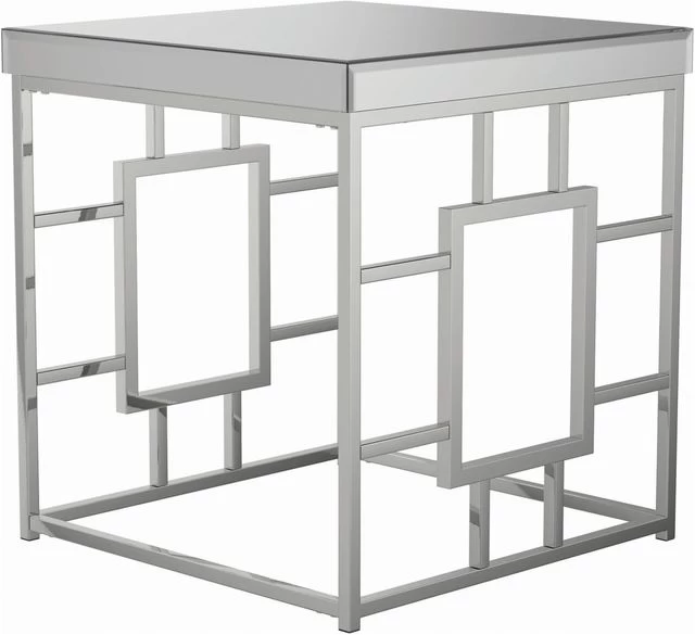 Accent your space with this modern end table. Showcase your flair for architecture with the geometric frame design. Brighten up any contemporary space with the mirrored tabletop. The metal frame is electroplated in a shiny chrome finish for the ultimate in sophistication. Piece pairs well with coffee table from same collection.