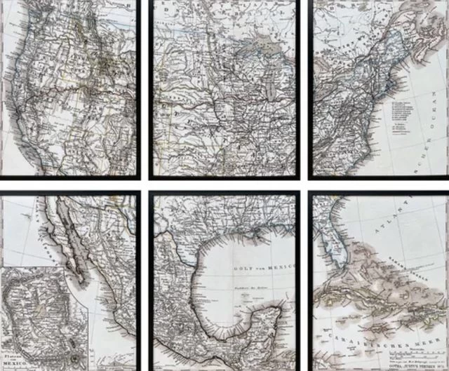 Set of 6 canvas paintings on the USA map with black gallery frame