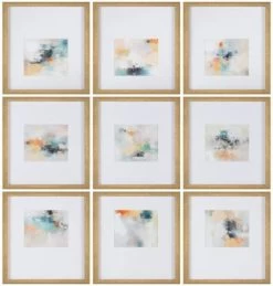Measuring at 16 x 20 inches each, the paintings are expertly off-centered on the matte board, creating an eye-catching and dynamic effect that will draw the viewer in. The bold, abstract designs are bursting with bright and colorful shades, ranging from pinks and blues to yellows and greens, making these paintings a true feast for the eyes. To add an extra touch of elegance and sophistication, each painting comes finished with a beautiful gold frame that complements the colors of the artwork perfectly. The combination of the gold frames and the bright colors of the paintings create a truly striking effect that is sure to impress.