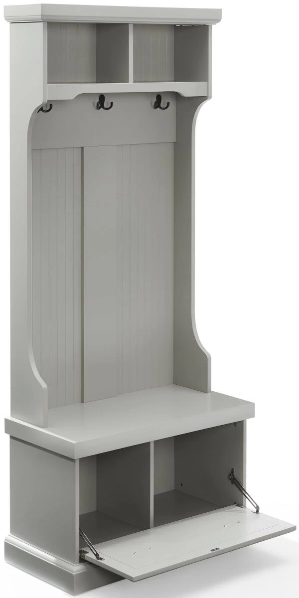 The three double prong hooks provide hanging storage for coats and book bags, while the two open shelves at the top can hold smaller items like your wallet and keys. Keep your home’s entrance clutter-free with the Shoreline hall tree.