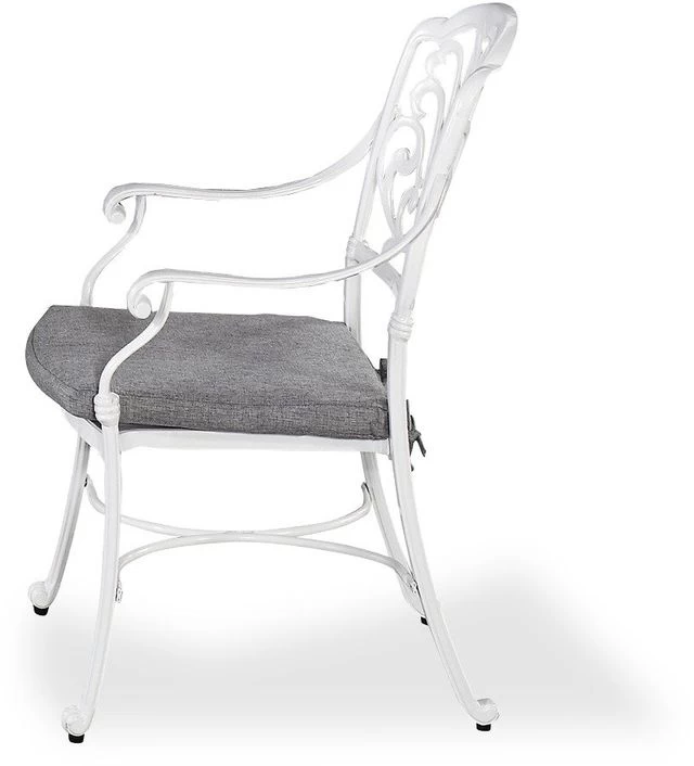 Bring a garden party to your outdoor spaces and bring outdoor living to life. This Capri arm chair with cushion is made of cast aluminum with a powder-coated finish for a clean, crisp look. Add a Capri table to create a complete outdoor retreat. Both chairs are built to withstand the elements, from the cushions to the stainless steel hardware.