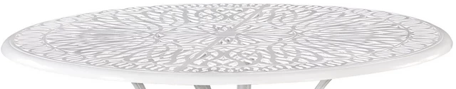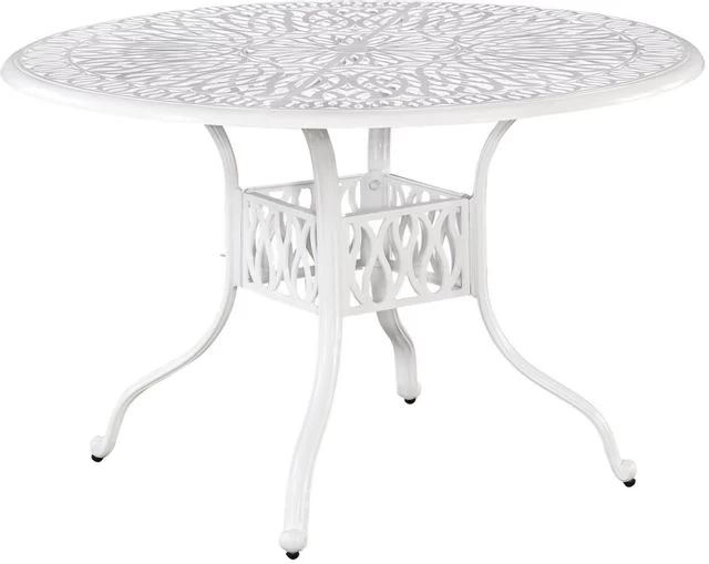 Bring a garden party to your outdoor spaces and bring outdoor living to life. This Capri 48″D dining table is made of cast aluminum with a powder-coated finish for a clean, crisp look. The floral-patterned table top includes a 2″ umbrella hole that comes with a white cap to plug it when not in use. The entire table is built to withstand the elements, from the table top to the stainless steel hardware.