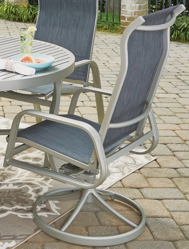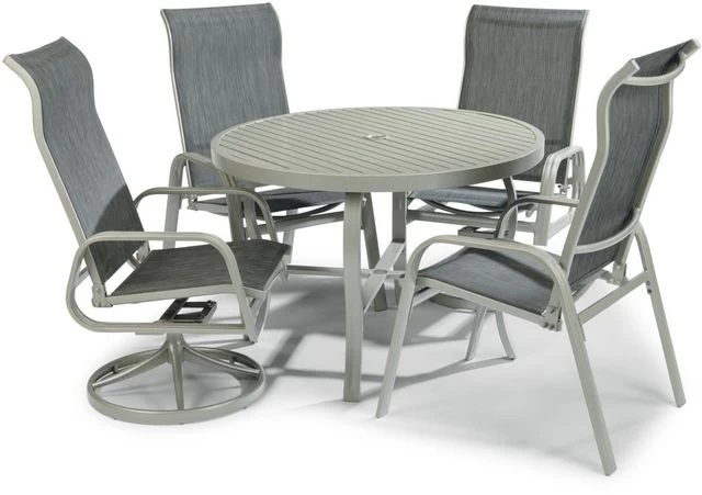 Enjoy the good life with this Captiva 5-piece dining group, which turns your outdoor spaces into inviting retreats. The set includes a 48″D dining table, two swivel chairs, and two arm chairs, all in a lightweight aluminum frame that will make your outdoor living maintenance-free. The table features cross leg supports for added stability, and a center hole for an umbrella with a cap to plug it when not in use. The swivel chairs and the arm chairs feature contoured sling seats with high backs that you can relax in for hours. Table size: 48″W x 48″D x 28-3/4″H. Arm chair size: 23-1/4″W x 29-3/4″D x 43-1/4″H. Swivel chair size: 23-1/4“W x 28-1/2″D x 43-1/4″H.