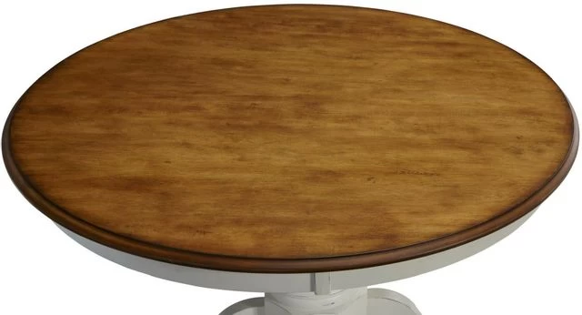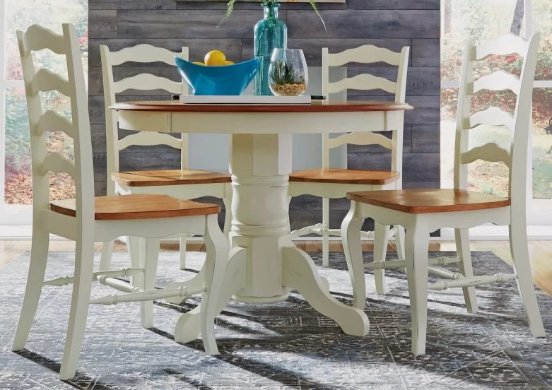 Give your dining room or kitchen a dash of French elegance with this French Countryside 5-Piece Dining Set by homestyles. The pedestal table is constructed of solid hardwood and engineered wood in a distressed oak and heavily rubbed white finish. The oak table top and seats feature several distressing techniques, such as worm holes, fly specking, and small indentations. The legs feature a distinctly classic Cabriole or French design. The set includes a table and four chairs. The chairs feature contoured seats for added comfort.