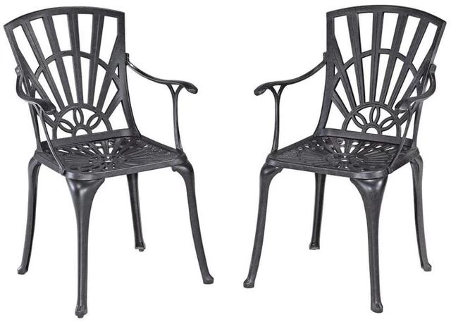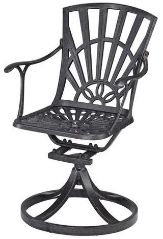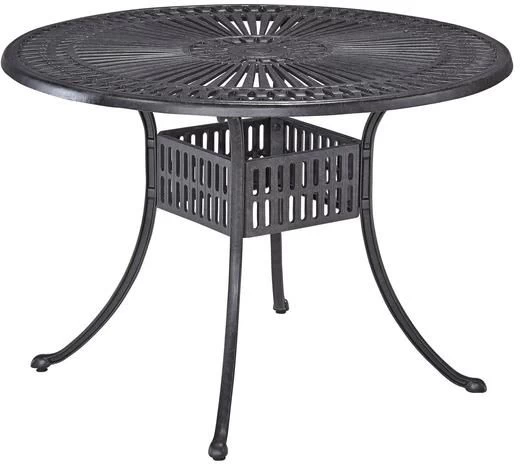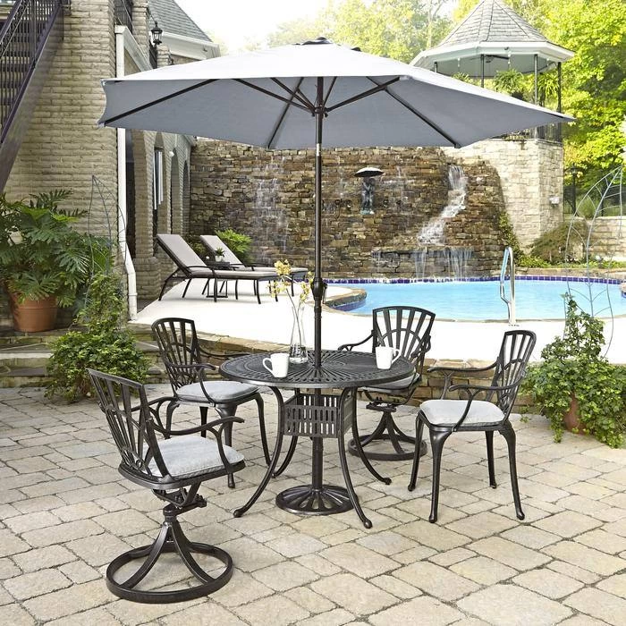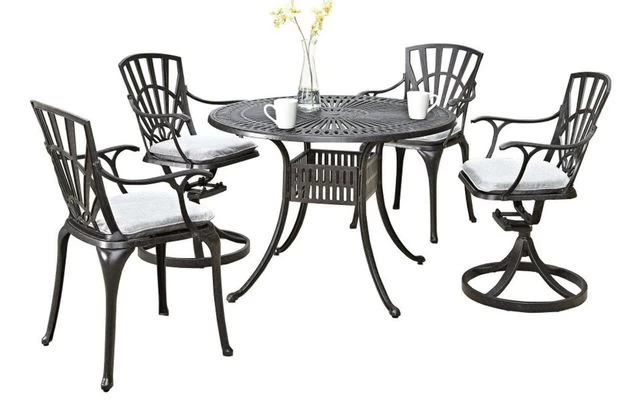 Create paradise in your own backyard. This Grenada 5-piece Dining Set by homestyles has a cast aluminum frame and is UV-resistant, with a hand-applied, powder-coated finish that’s sealed with a clear coat. The set includes a 42″D table, two swivel chairs and two arm chairs for gathering with friends and family. Chairs rotate 360 degrees and rock, providing total freedom of movement. The seat design prevents water from collecting. There is an umbrella hole, with a cap when not in use. Nylon glides keep the pieces firmly in place and all hardware is rust-proof stainless steel.