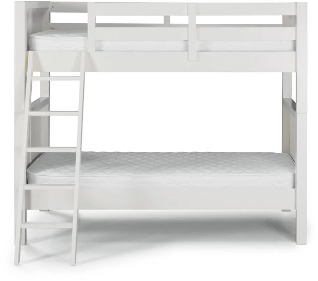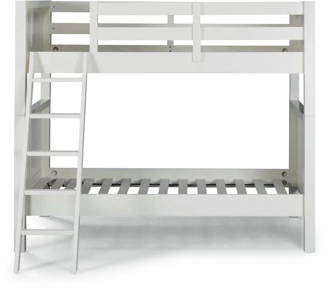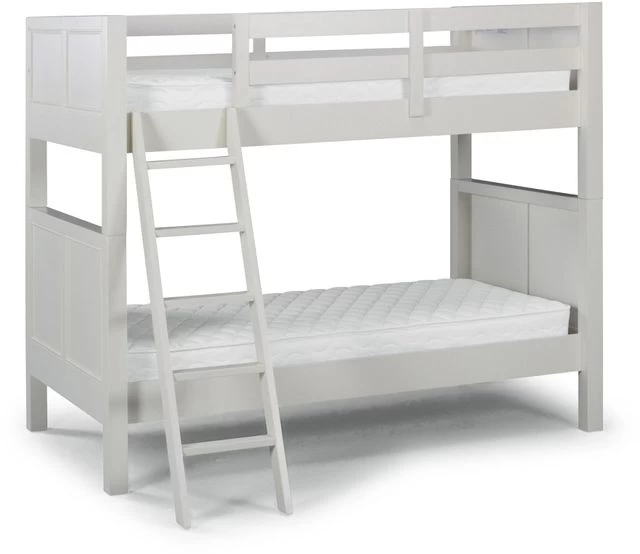 Transitional design that works in any décor. Crafted of solid hardwoods, laminated veneer lumber, and engineered woods, finished in an off-white satin painted finish. Laminated veneer lumber is a construction grade product used to make beams for framing and is stronger and more durable than solid wood. It is used in key areas for added strength and safety. Bed includes floor to top bunk angled ladder, for easy access to top bunk, and includes slates for mattress support, mattresses not included. Duel frame paneled headboard and footboard for added design element with dual rail upper bunk side protection for safety and stability.