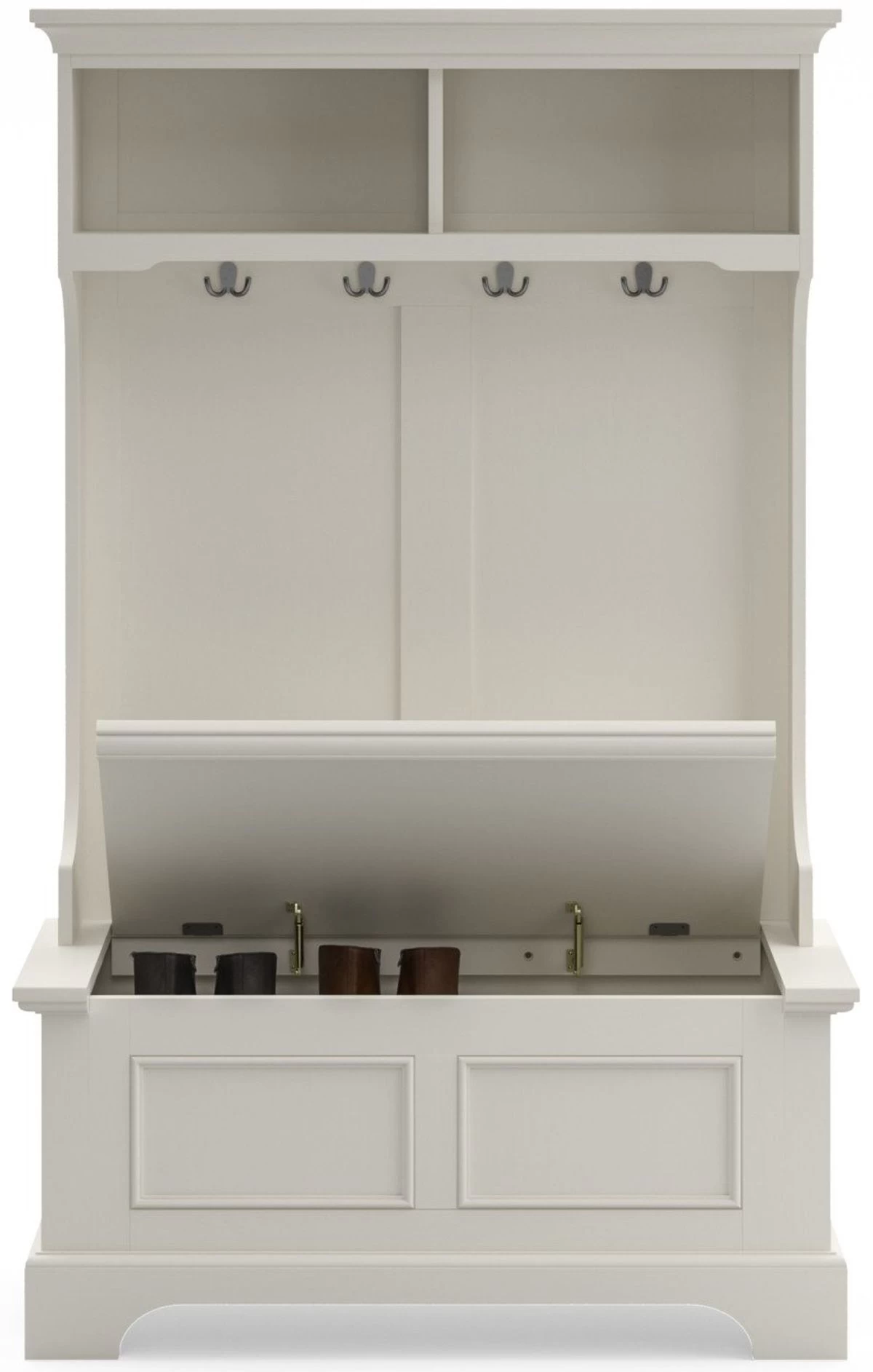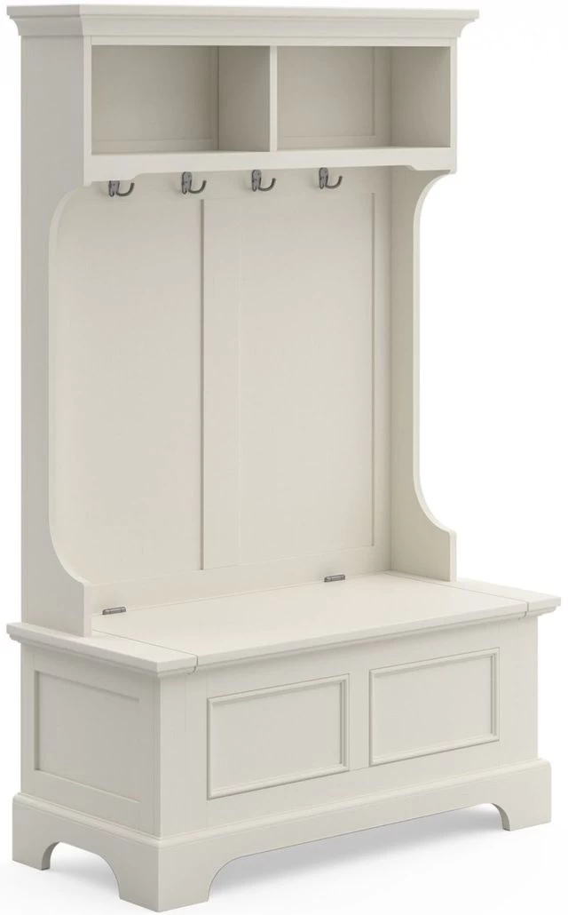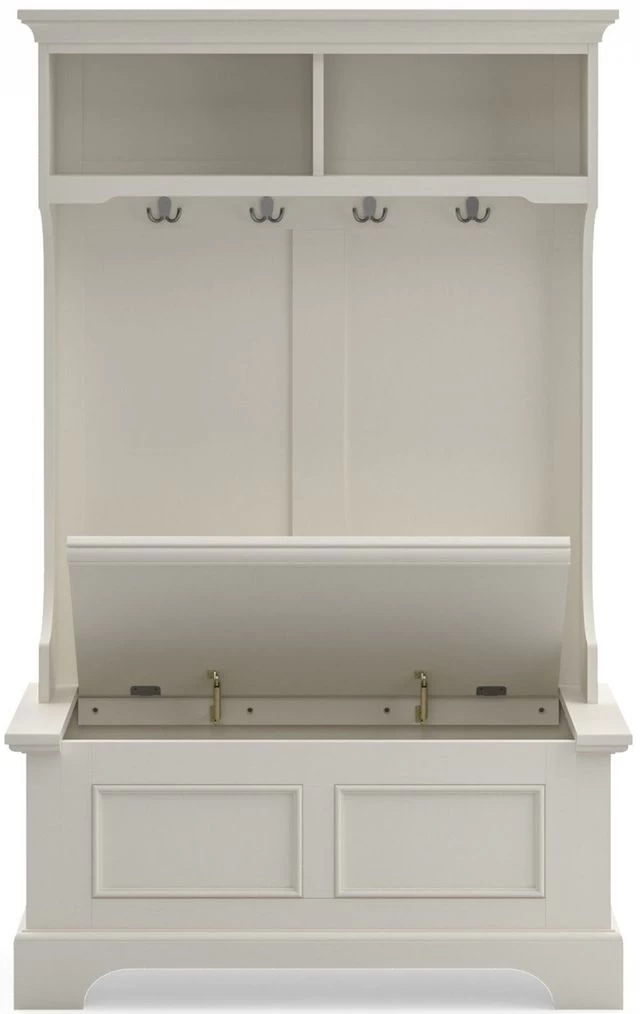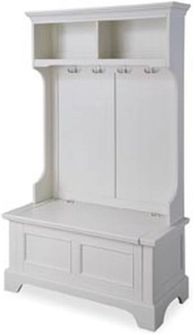 This Naples hall stand provides ample storage and organization with two open storage shelves, four double storage hooks, and a lift-top storage compartment. A white finish over solid poplar and engineered wood make it a stylish, yet functional, addition to any mud room or entry hall.