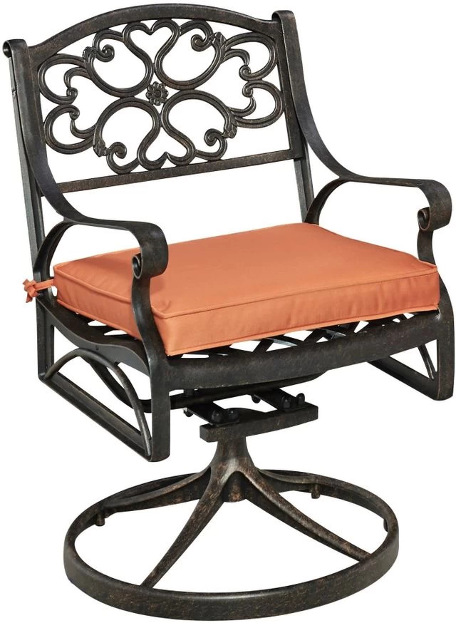 The difference between an average backyard and an open air sanctuary is found the classic comfort and traditional style that Sanibel delivers. This 5-piece dining set includes a round table and four swivel chairs with cushions, all made of cast aluminum with a powder-coated finish and a clear coat that offers total protection from the elements. The table top and seat design allows water to quickly drain through to prevent pooling or staining. The center umbrella hole includes a cap to cover it when not in use.