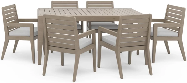 The water-resistant cushions and gray acacia wood with a UV-resistant finish deliver solid performance year after year.