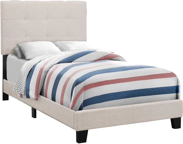 Low profile twin bed frame upholstered in a beautiful grey linen look fabric; padded headboard boasts an elegant tufted design