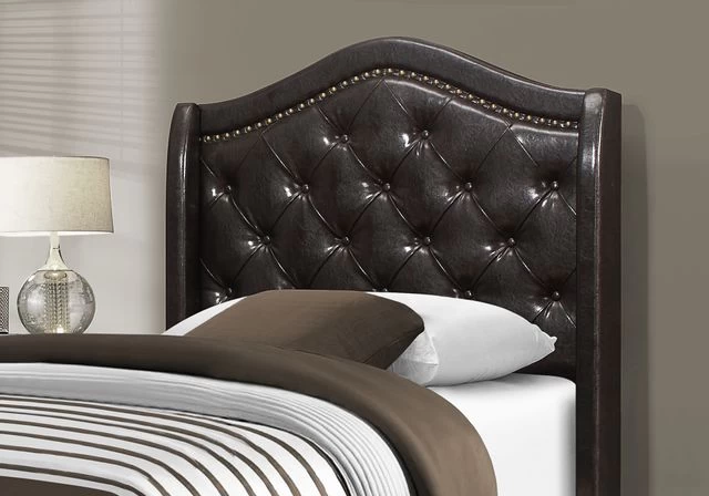 Give your bedroom a master appearance with this luxurious twin size bed frame and wing back headboard, upholstered in a sophisticated brown leather-look fabric. The gently curved classic style of this floor length headboard, outlined with a brass nail head trim and cushioned diamond tufting, gives the bed a statement making flair. The clean lines of the upholstered sides and front frame brings a contemporary touch; the black solid wood legs, slightly angled at the front, adds stability to the whole bed frame. The box spring and mattress is not included and must be purchased separately. All parts and assembly instructions are included.