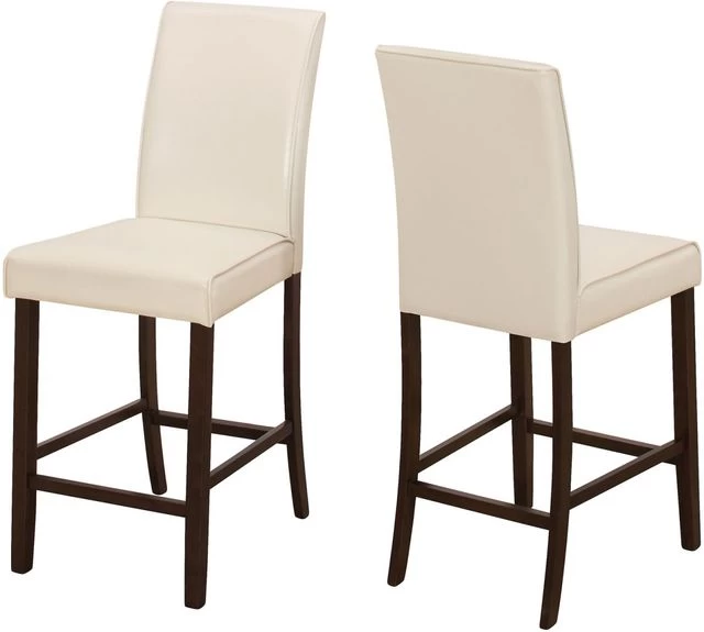 Take casual dining to a whole new level with this set of 2 counter height leather-look chairs. Built for comfort with a padded seat and back and a well positioned footrest for stability, these chairs offer contemporary appeal that will provide years of lasting enjoyment. Upholstered in an ivory easy care material, these counter height chairs are ideal for your kitchen, dining room, breakfast bar or loft.
