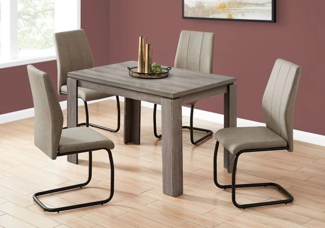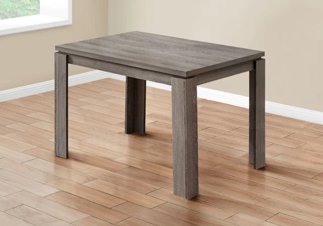 Reclaimed wood look dining table in a trending taupe color with thick, block-style legs to keep everything in its place during large gatherings