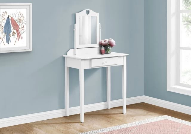 Every girl wants her own special spot to practice her beauty regime, and this contemporary style vanity table with mirror will be a stand-out in her bedroom. The smooth white satiny finish gives a fresh feel to a room, with a spacious tabletop to place a hairbrush, makeup, or special perfume. The closed storage drawer, accented with a crystal look knob for a touch of glam, is handy to store other small makeup or hair supplies. The mirror with the cute heart cut-out on top, tilts so she can get a good view at any angle. This dresser table on solid wood legs will keep everything organized in one place whether she is trying out new hairstyles, getting ready for school, or a fun day out with friends! Assembly is required.