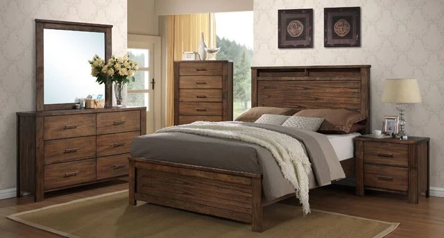 This casual bedroom group provides a simple design with emphasis on an attractive finish featuring a satin finish with subtle distressing. A small display shelf can accommodate accessories or simply house your TV remote for quick access.