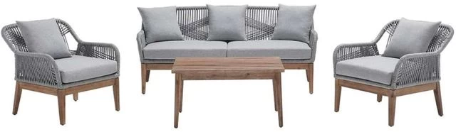 Solid acacia, Powder coat aluminum frame, Rope, 100% Polyester fabric, 80% PU Foam, 20% Poly fiber