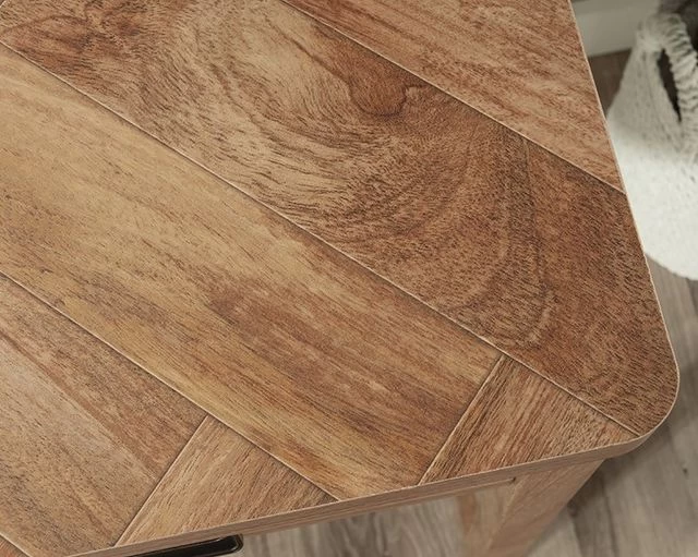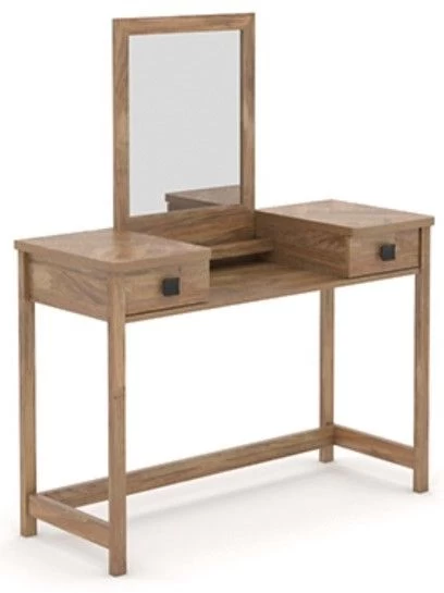 This bedroom vanity with a mirror features two drawers with metal runners for items like eye shadow pallets, makeup brushes, hair care products, and a curling iron. This makeup vanity with a mirror features a raised shelf for nail polish, hair ties, and more. Assembly is a breeze with the T-lock drawer system because we know you want to spend less time assembling and more time glamming. A cord management system makes for reduced cord clutter as you are charging your phone, doing your hair, and more. Finished in Sindoori Mango® with a herringbone top pattern, this bedroom vanity takes your cosmetics prep to the next level.