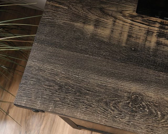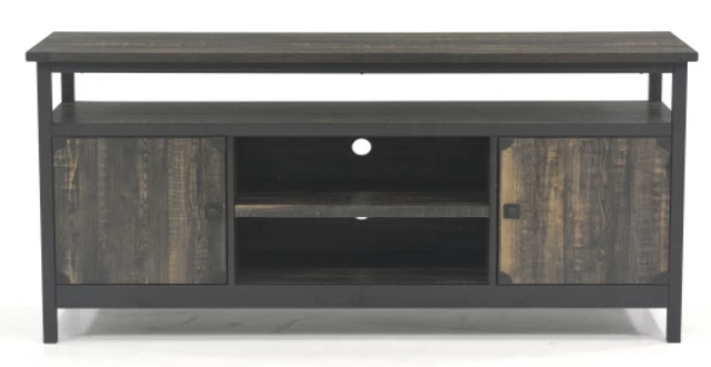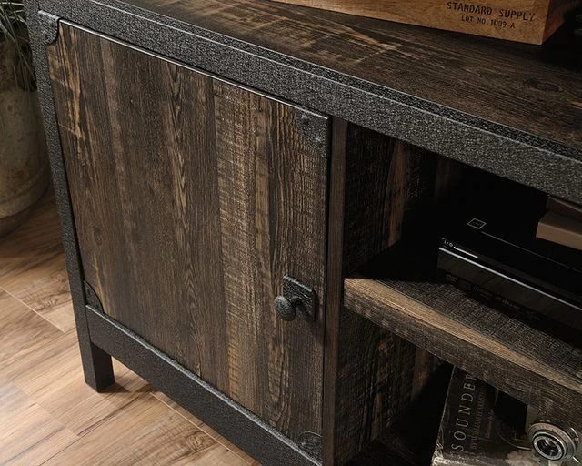 Create a beautiful focal point in your home when you add the industrial-inspired style and versatile design of this credenza from the Steel River collection. This TV stand accommodates up to a 60” TV, making it the perfect spot to gather around for all day movie marathons or binge watching your favorite new show. Already have a TV stand? No problem. This credenza offers a spacious top surface to display items like an accent lamp, decorative plants, and photos of your family and friends. This entertainment credenza offers a large open shelf that is ideal for storing items like video and gaming equipment. A rustic TV stand, it also includes an adjustable center shelf that can move to different heights to create flexible storage for items like video games, movies and your favorite knick-knacks. Behind each door is a hidden storage area that includes an adjustable shelf for additional storage space. This media stand features a textured, powder coated metal frame along with corner accents for an extra touch of style. Finished in Carbon Oak, this good-looking industrial credenza is sure to stand out in your home.