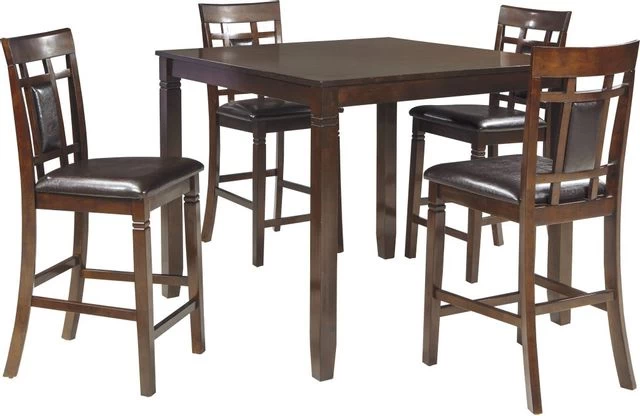 This Bennox 5-piece dining set features 4 counter-height stools with backs and a square table in a rich, dark-wood finish.
