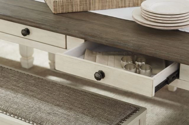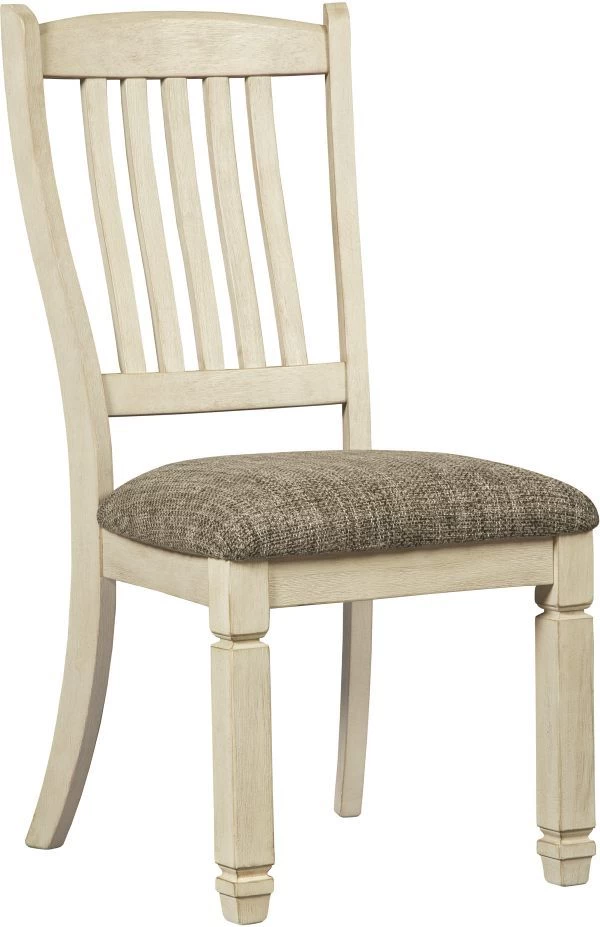 Designed to provide comfort and flair, the rake-back dining chairs are decorated with a cushioned seat covered in a heavy woven fabric that complements the antique white finish of the chair. Contoured seat cradles you in cushioned comfort while lattice peekaboo detail on the back makes this a striking chair from all angles. The server is a dream come true with two adjustable shelves that offer large capacity and a spacious top that’s perfect for setting a buffet. Embellished with the casual appeal of three latticed doors, an attractive planked top with weathered oak finish and a lightly distressed white finish throughout, this vintage look will serve up elegance for years to come.