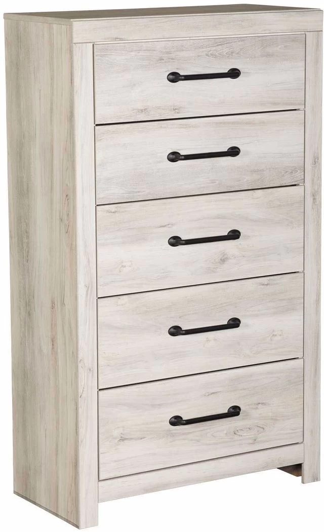 This Cambeck chest features 5 smooth-gliding drawers, faux linen laminate lining, and a space saving, vertical design. Elongated metal drawer pulls accentuate the look of your room.