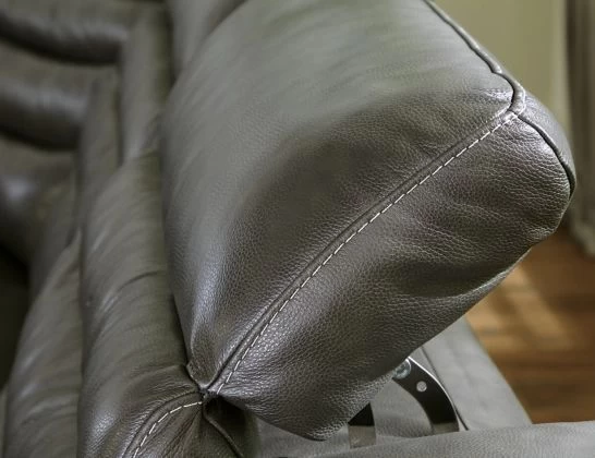 Leather throughout the seating area, inside back and armrests; faux leather covers remaining areas