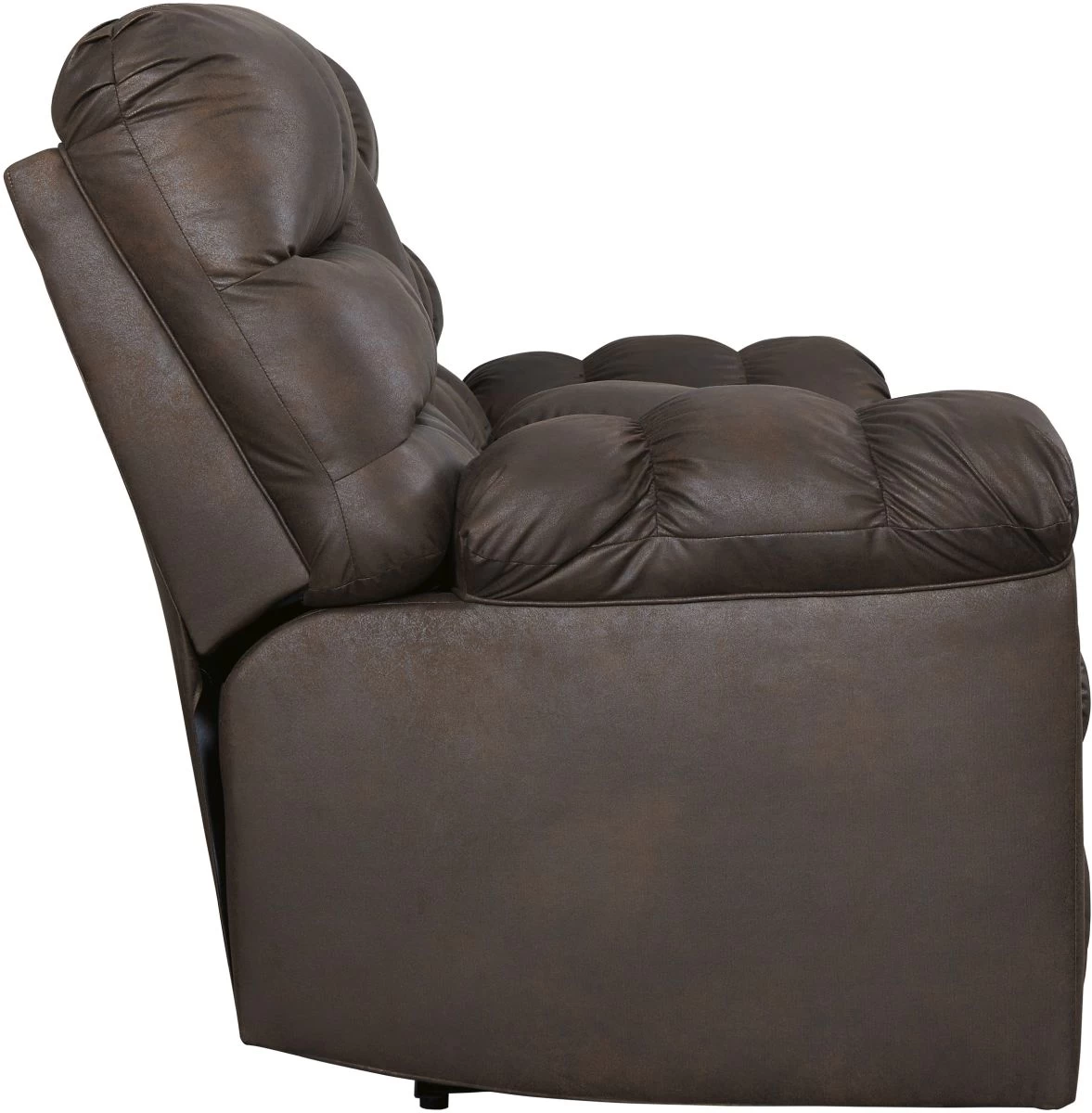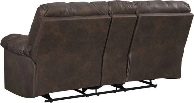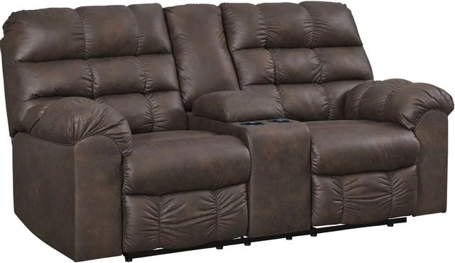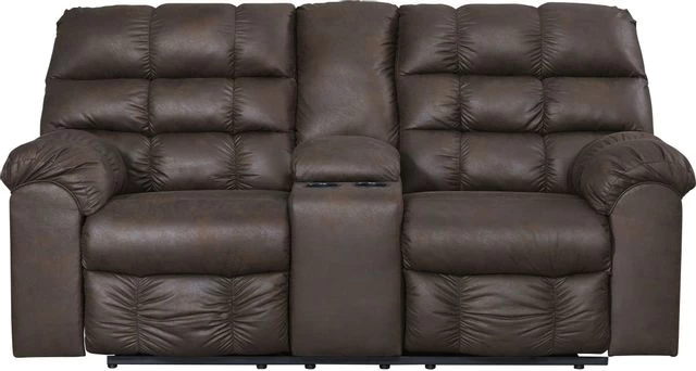 A distinctive biscuit back design enhances this recliner’s contemporary flair. The center console and handy cup holders complete the experience.
