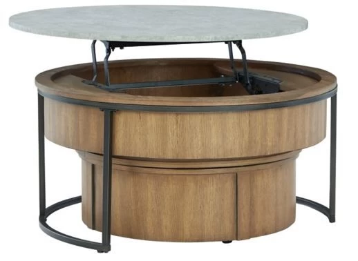 Beautiful to behold, this nesting coffee table set is loaded with style. Featuring an urban contemporary profile, the coffee table features a suspended drum design and a durable faux cement melamine lift top with hidden storage. Equipped with casters for easy access, the rolling trunk does double duty as serving space and storage. Perfect for mixed-use living arrangements.