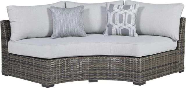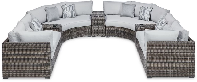 Includes 2 outdoor armless chairs with cushions, 2 corner chairs with cushions, 3 consoles with drink holders and 2 outdoor curved loveseats with cushions