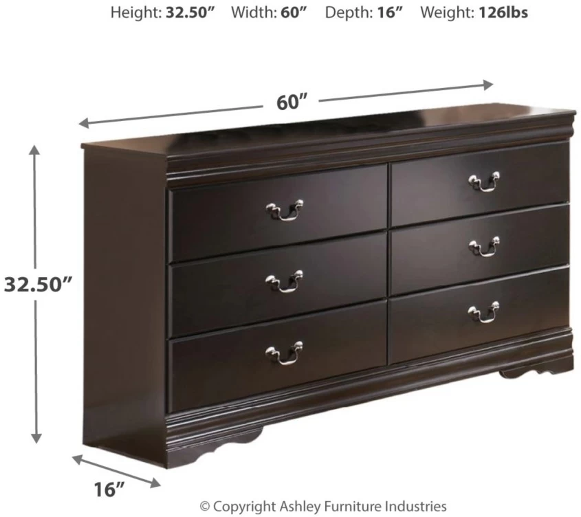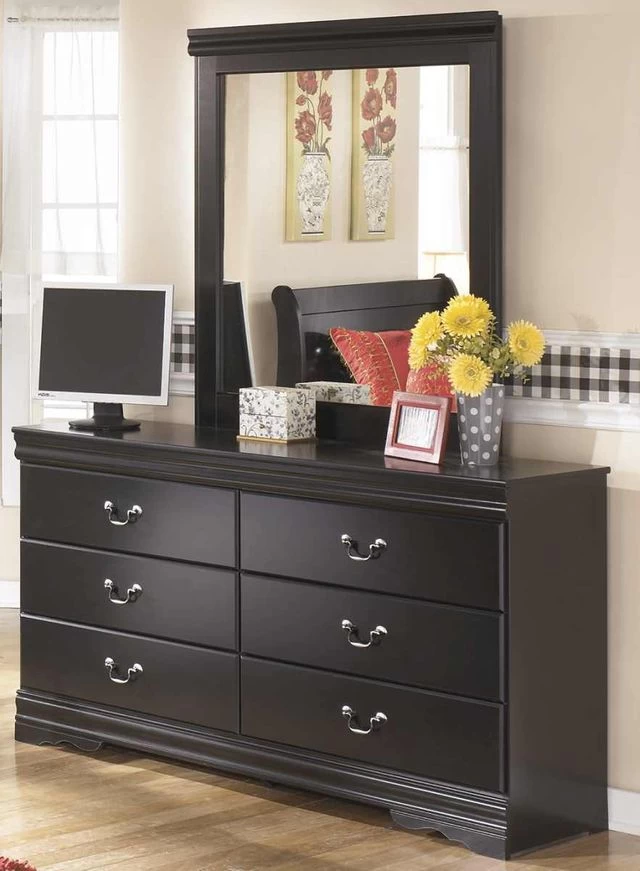 Louis Philippe styling. Trendy replicated black paint. Shapely top mouldings on the case pieces. Antiqued pewter color metal hardware complementing the Louis style. Side roller glide drawer system for smooth operating drawers.