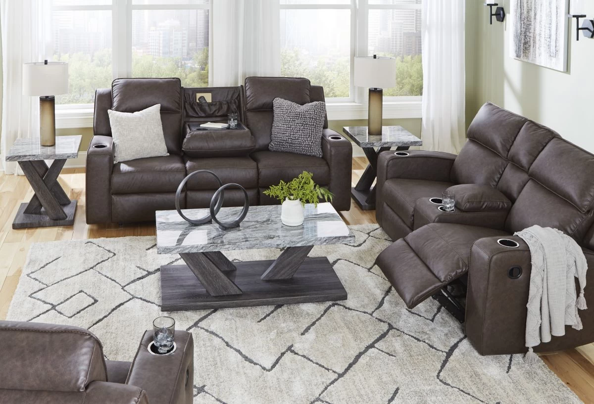 Sleek track arms elevate the look with a touch of modern sensibility. A padded center console with dual cup holders completes the experience.