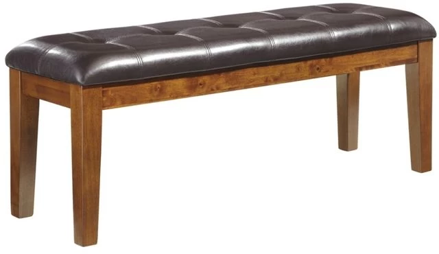 Generously Seat up to 6 with the Ralene 6-piece dining table and its extension leaf with convenient self-storage. This set includes 4 slat-back chairs luxuriously and bench upholstered in faux leather over soft foam cushioning.