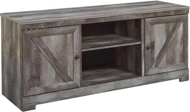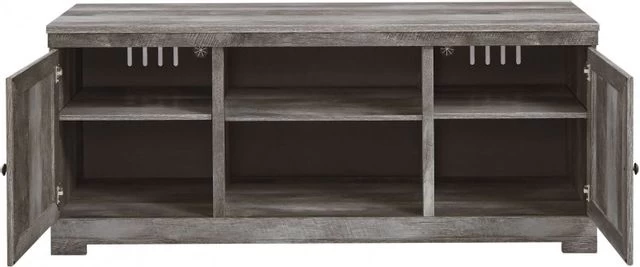 Rustic gray planked replicated Oak grain with authentic touch. Entertainment unit features round knobs in a dark bronze color finish. The W440-68 is compatible with the W100-01,02 LED fireplace insert. Entertainment piers feature open glass shelving for display with display light and doors for storage. Doors on the entertainment piers and TV stand have adjustable shelves. TV stand features crossbuck details on the doors.