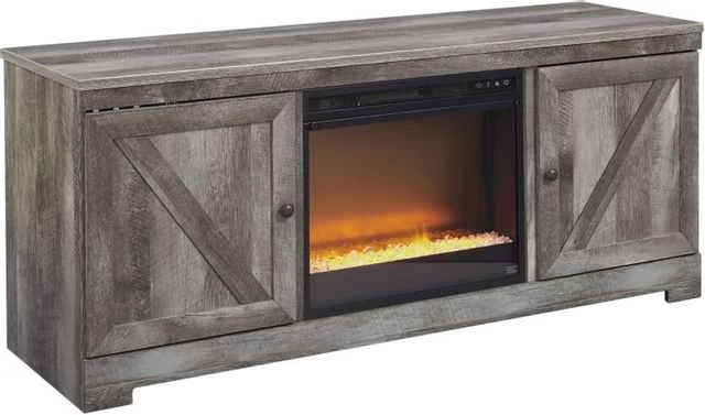 This TV stand with fireplace insert is sure to win your heart with its daring designer take on modern rustic. The stand’s crisp, clean and minimalist-chic profile is enriched with a striking replicated oak grain with thick plank styling and a weathered gray finish for that much more authentic character. Crossbuck detailing adds a brilliant barn door inspired touch. Adding that much more show-stopping style: an LED fireplace insert that operates with or without heat and includes a six-level temperature setting, remote control and overheating control for added safety. The fireplace insert comes with optional faux glass crystals and natural stones, so you can customize the look of the flame bed.
