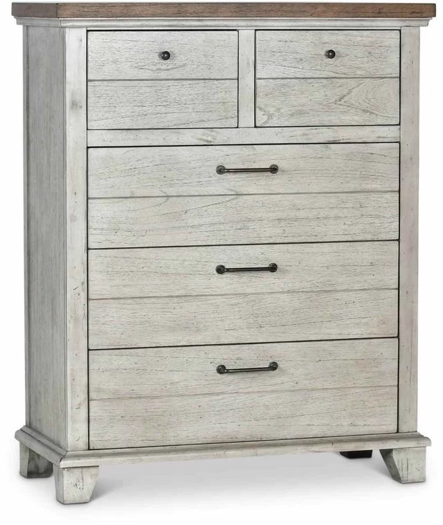 The Bear chest by Steve Silver is part of a rustic, farmhouse-inspired bedroom collection. With an ivory finish and honey stained top, it features deep drawers and pewter finished hardware.