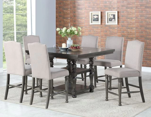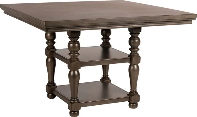 Transitionally styled counter dining table with elements of traditional and contemporary design to fit with virtually any decor. Turned legs on the pedestal counter table blend beautifully with the fashion-forward harbor grey finish to create a striking dining table. Pair with the counter chairs or counter bench from the Caswell collection or pick from other counter chairs in the line to fit your style. The counter table offers comfortable seating for up to eight people.
