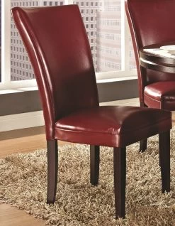 - Bonded leather parsons chair in choice of red or brown has solid wood legs and stretchers.