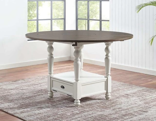 Gather ’round the counter height dropleaf table from the Joanna collection. This 59 inch round table is packed with features the entire family will love starting with a double-drop leaf top that expands to seat up to eight. At the heart of the table-top is a lazy susan that makes serving dinner much easier! The turned leg counter base features a drop-down storage compartment for easy storage.