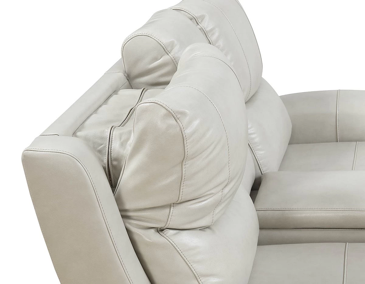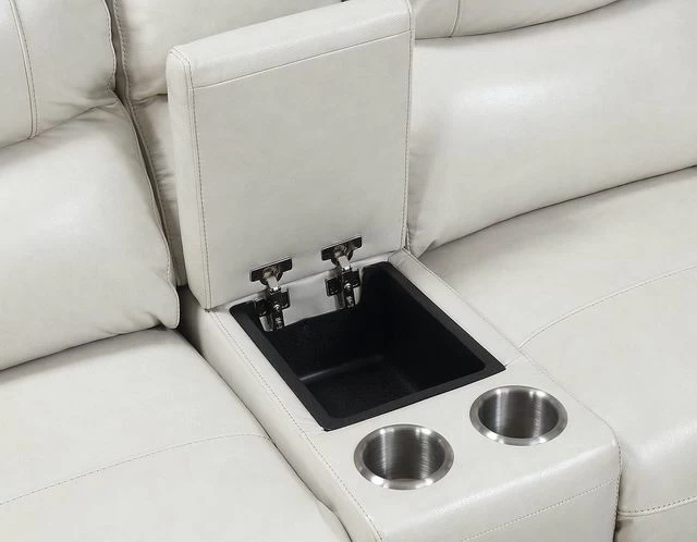 Contemporary styled collection constructed in leather with power leg rest and power articulating headrest. Laurel features both styling and convenience with USB charging port on the control panel along with a home button to return the piece to its original position. The ivory sofa and loveseat feature dual reclining seats and the loveseat feature a console with cup holders and hidden storage.