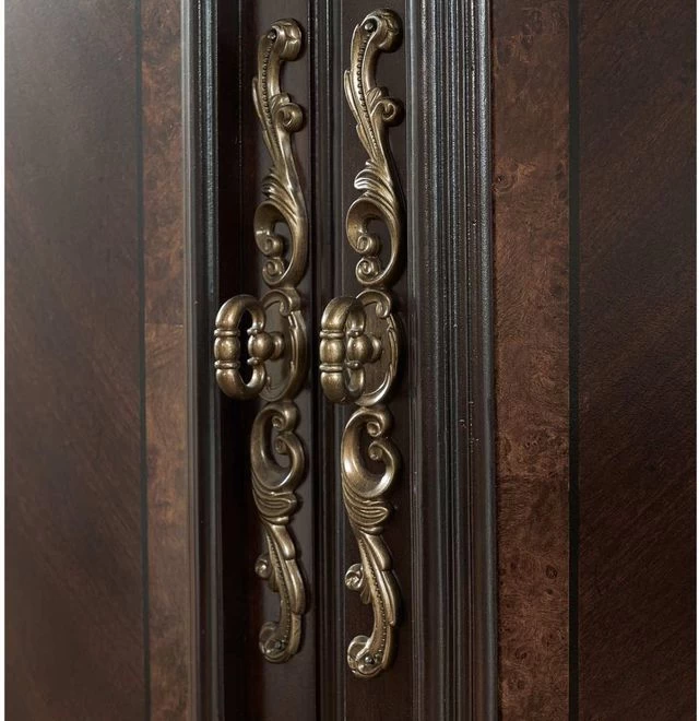 Styling details include antiqued brass hardware, felt-lined top drawer with shaping on case pieces, metal and gold tipped accents