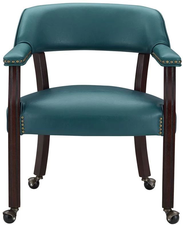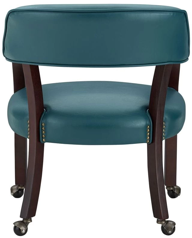 Chair features casters, padded seats and backs that have decorative nail head trim and are upholstered in a durable teal vinyl that is easily cleaned.