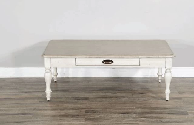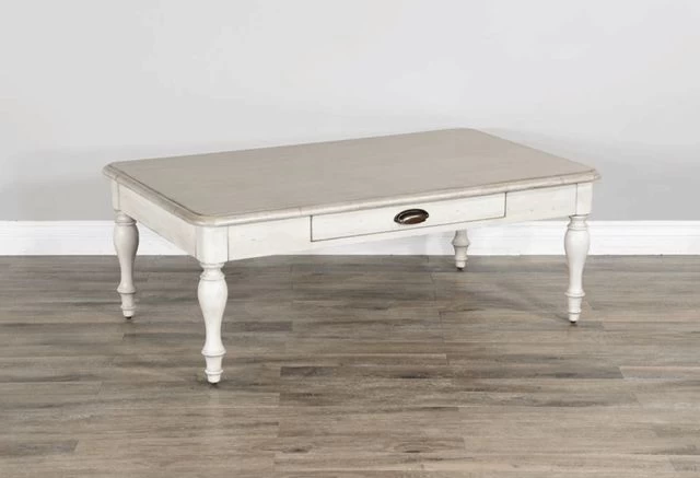 Complete your living area with this gorgeous cocktail table finished in a Westwood Village finish. It features a tone on tone finish, decorative cup hardware, and turned solid mahogany legs.